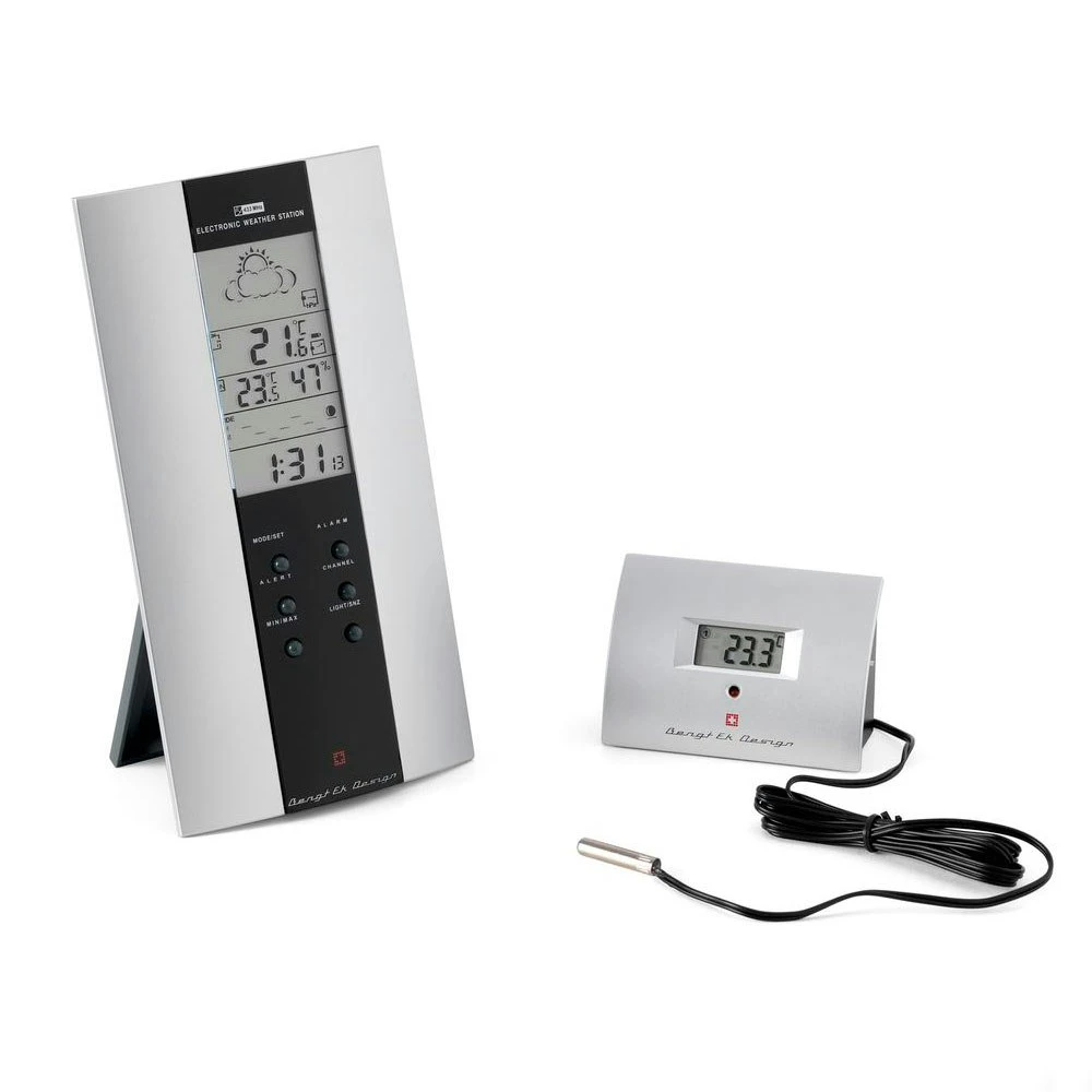 Wireless weatherstation from Bengt Ek Design provides you with weather forecasts for sunny, light cloudy, cloudy, rain and thunder. Can connect with 3 wireless devices.